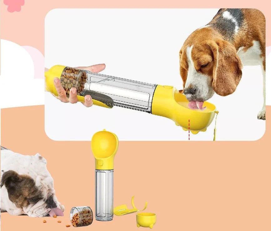 2. Botella de agua multifuncional: su mascota puede disfrutar de agua y alimentos puros y seguros mientras viaja o camina. Además, puede limpiar las heces de su mascota con la pala incluida y guardarlas en la práctica bolsa incluida.